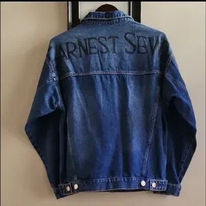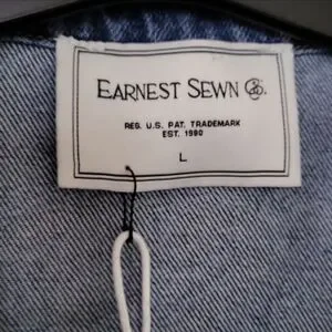 Stylish blue denim jacket with button details from Earnest Sewn, the NY-city based premium denim brand that operates on a "sewn in earnest" mentality. Features spread collar, front button closure (copper tone buttons with ES monogram), dual chest pockets, dual side pockets, single button barrel cuffs and buttoned cinched tabs at back. ES insignia on back yoke.