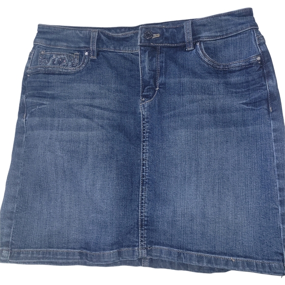 Elevate your wardrobe with this classic blue denim skirt. Perfect for casual outings and versatile styling. Button and zipper front closure and 5 pocket design.
