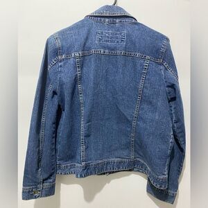 This timeless blue jean jacket features a fitted silhouette and a slightly faded look, perfect for casual layering. Its traditional length and visible topstitching add to its classic appeal.