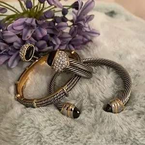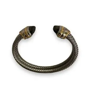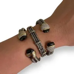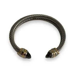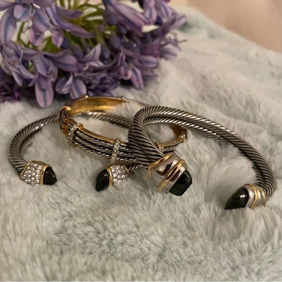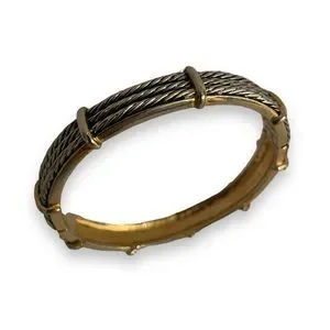 Trio of two-tone fashion bracelets. Twist cable cuff style. Classic, polished and stackable. I think these are stainless steel but I cannot be sure. They are well made -- I have held onto them for a long time.