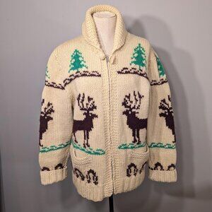 A large, warm and wonderful traditional Vintage Canadian Cowichan sweater, featuring Brown moose or Elk or Reindeer and green evergreen pin trees on an off-white background. Hand knit and assembled. Perfect as sweater for winter, or as a jacket for those dry crisp spring and autumn days. These cardigans are fantastic to use when working in the yard and when cared for properly, will last for decades!