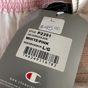 Classic Champion Capri Pants in size Large. White with light pink colourway. NWT new with tag attached, never worn. Please note there are some spots on these pants from being stored (see pics, some small spots, not very noticeable). Smoke free home.