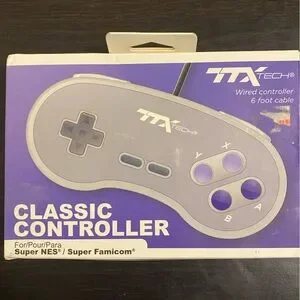 classic wired controller in gray. Designed for retro gaming compatibility with Super NES / Super Famicom systems. Comfortable ergonomic shape and responsive buttons for precise control. Includes 6-foot cable for reliable wired performance.