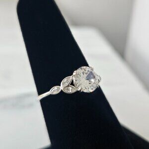 Classic Engagement Style Round Halo ring with leaf band, 925 Sterling Silver
