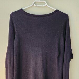 This is a classic black knit sweater dress was purchased from AW&CO, featuring a soft, cozy texture with long sleeves and slightly fitted silhouette. The dress has a stylish cutout bow, on both sleeves, adding a touch of elegance, feminine accent. Labeled size XS, but fits comfortably up to a Large size. Perfect for cooler weather, it balances comfort and sophistication.