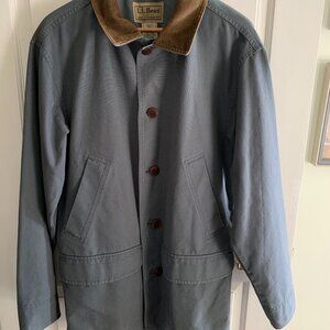 This men's regular small classic LL Bean canvas coat with a corduroy collar is new without tags, never been worn, and is waiting for the right person to wear it. It is cut straight and has two sets of pockets on the sides of the front. It is a really earthy blue/grey colour with a brown collar and feels like it is made with great care with quality fabric. This piece is timeless and can be worn during sweater weather. Make it yours!