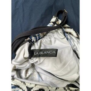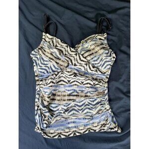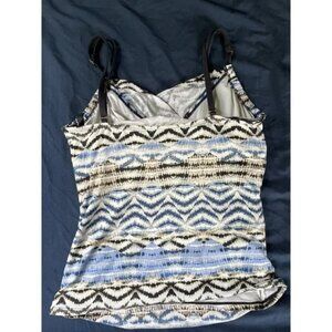 La Blanca women’s ruched swimsuit tankini top - TOP ONLY. Blue white and black pattern with padded cups and spaghetti straps that are adjustable. Size and material tag removed- would best fit a size medium. Please review measurements. In excellent condition.
