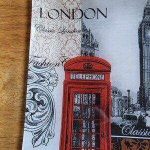 THE DESIGN INCLUDES ICINIC LONDON IMAGERY SUCH AS A RED TELEPHONE BOX, THE BIG BEN CLOCK TOWER, AND A DOUBLE- DECKER BUS ALONG WITH SCRIPT STYLE TEXT.