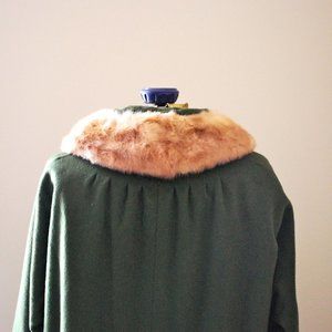 This Classic Olive/Army Green Wool Coat with Fur Collar has beautiful seaming across the breast and pleating below the back collar. It fastens down the front with 3 vintage buttons and has 2 inset pockets.