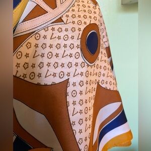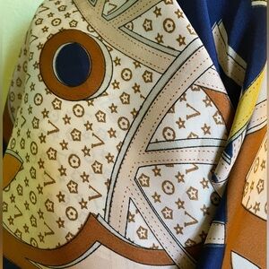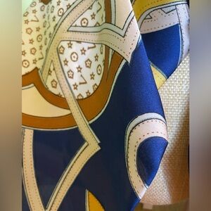 Elegant, brand new scarf featuring a designer pattern in blue and gold. Perfect for adding a touch of luxury to any outfit.