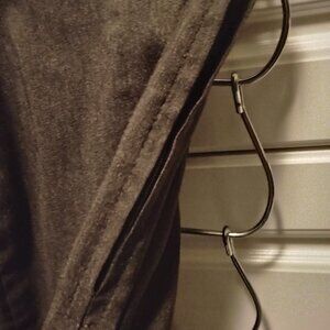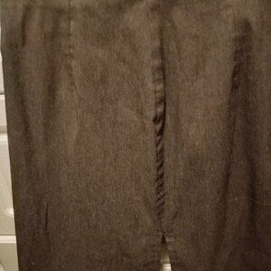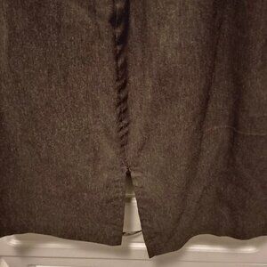 In a dark grey. Side zipper. Slits which can be worn back and front or side to side. I'm about 5'7" and it falls just at or above the knee. Appropriately form fitting.
