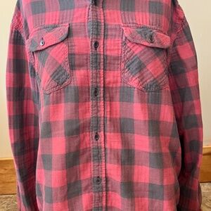 Red and Grey Plaid Flag and Anthem Button Up Shirt. Unisex. A great addition to your farm core inspired wardrobe. Very cozy material. 100% cotton. Flat measurements - p-p- 24". Length - 27". Arm 24".