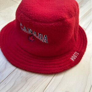 Classic Roots Athletics fleece bucket hat in bold red with embroidered Canada and maple leaf on the front, plus Roots stitched on the side. Cozy, warm, and perfect for Canadian winters or vintage sportswear collectors. Made in Canada with quality craftsmanship.