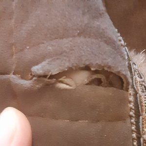 The only damage issues are very slight issues: the interior pocket has come loose as seen in pictures but doesn't cause any issues at all to the actual pocket. One of the slits you insert the button through is a bit worn as seen above but is no issue at all and doesn't effect the funtion of the button. And lastly a very tiny amount of wear on one sleeve but not noticable.