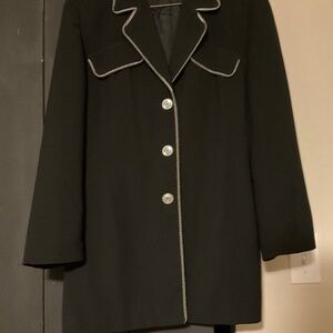 Perfect jacket for those on the go….size 10 loose fit. Wool blend. Color black with black and white detailing. This jacket will take any pant or skirt to the next level.