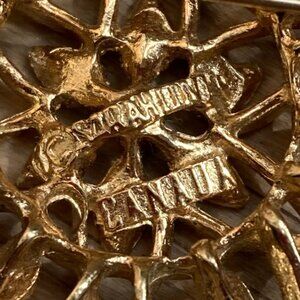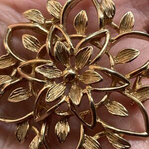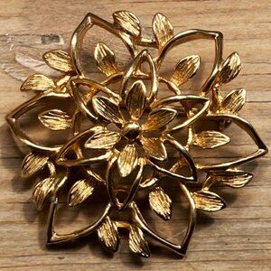 A lovely piece created by the Canadian company Sarah Coventry, this flower inside flower goldtone brooch is about 1-3/4 inches in diameter. Marked ©Sarah Cov - Canada. In great shape.