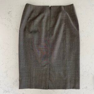 Features: back invisible zip closure, lined, pencil, back kick pleat, 100% virgin wool, subtle check pattern, office, evening
