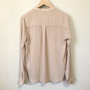 Very good preowned condition, two tone, bisque/beige/creamy-pink, sheer chiffon, button tunic collar blouse by Forever 21. A nice quality piece that is lightweight and easy to layer. Camisole is advisable.