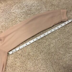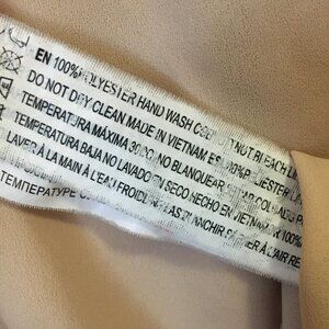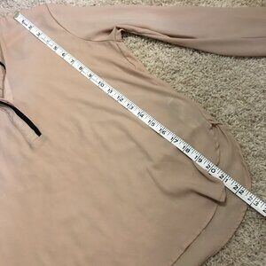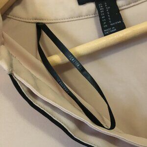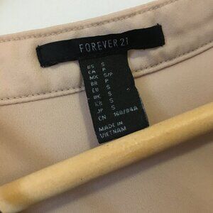 Very good preowned condition, two tone, bisque/beige/creamy-pink, sheer chiffon, button tunic collar blouse by Forever 21. A nice quality piece that is lightweight and easy to layer. Camisole is advisable.
