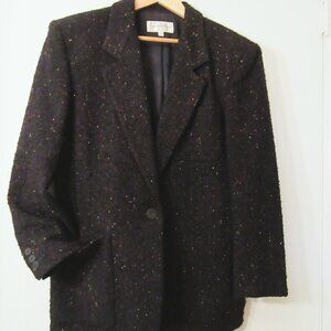 Wool blend vintage one button single-breasted blazer jacket in light boucle weave from Liz Claiborne, size 6-7. 96% wool, looped/fuzzy marled weave in deep black and tiny specks of various colours. Straight style with padded shoulders, long collar, one button front, 3 button sleeve cuff. Rounded 3 pockets on the front and lower back slit. Lining under the whole item. Ideal for 80s, 90s, academia, preppy, neutral, and classic vibes. Perfect for fall, winter, layering, capsule. Condition is preowned, like new. Dry cleaning only. Measurements: approx.