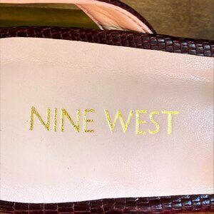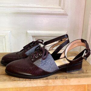 A really nice pair of shoes, with a nod to men's wear, worn only a couple of times. The uppers are part burgundy leather in a crocodile finish, part tweedy grey wool blend. Size 8.