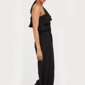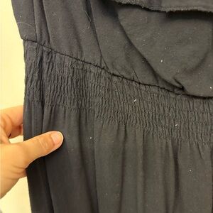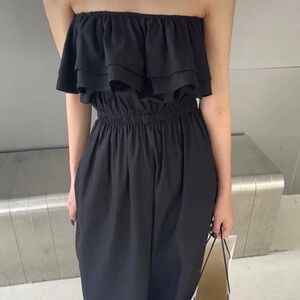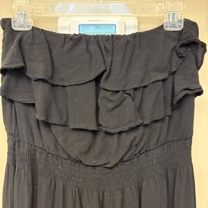 Description: Strapless black ruffle maxi long dress, stretchy, great for work, travel, paired with a denim jacket for fall/winter, or with slides for spring/summer. Travel. Work, Weekends.