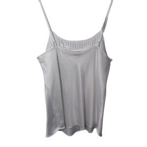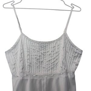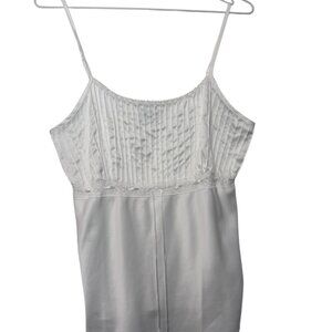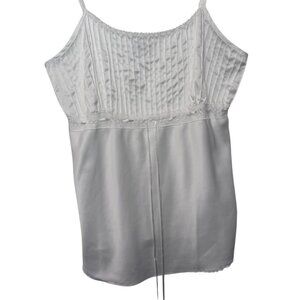 A white satin camisole top with spaghetti straps and a scoop neckline from the brand CLAUDEL. The top is styled with pintucks on the upper bodice and a lace trim detail at the waist. A thin drawstring runs through the lace trim, cinching the waist. This style is reminiscent of lingerie or loungewear, and is also sometimes worn as a top in a "coquette" or "hyperfeminine" aesthetic.