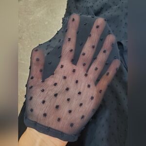 Claudie Pierlot Paris "Rififi" Dress. 3/4 Sleeves. Pull on dress. 100% Polyester. European size 38 = Size 6 US (see size chart in picture). Dress length is around 35 inches. Plumetis Dotted fabric as seen on pictures (textured). Lining on the body part excluding the sleeves. Sleeves are sheer, see through. Decorative bow (can be redone as you wish) at the upper back part of the dress. Excellent condition. No stain, no rip. Non smoking house.