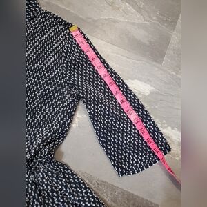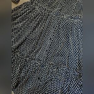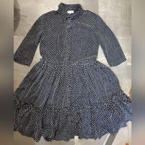 Claudie Pierlot Paris "Ruffled Shirt Dress". Textured Patterns. Collar. Tiered. Button down. 1/2 sleeves. Navy Blue & White. European size 36 = Size 4 US (see size chart in picture), see pictures for measurements. Dress length is around 36 inches. Lining in half the dress (waist down); Torso and sleeves are not lined, sheer / see through fabric. Dress is wider at the end like a skate dress. Excellent condition. No stain, no rip. Non smoking house.