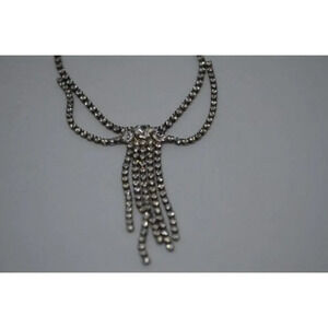 Pictures don't do this stunning clear rhinestone necklace justice! Square rhinestones on an 18" chain, coming to 3 larger stones in the center and 5 waterfall strands hanging below. The look is sort of like a sparkly bowtie. Really nice condition, clasp works well. A beautiful vintage piece great for a formal occasion like a gala, black tie event or wedding.