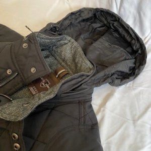Inside pocket, hidden rain hood, multiple exterior pockets with both zipper and button front jacket closure