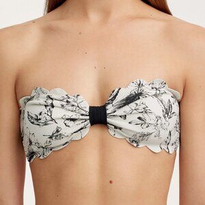 The best-selling strapless icon in Floral Print. Raw, hand-cut, scalloped edges trim this classic silhouette, with boning that provides the flattering shape the Antibes is best known for. Easy to match with black or white bottoms (any bottoms would look great, we have non- matching ones).