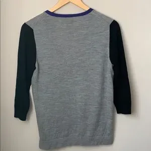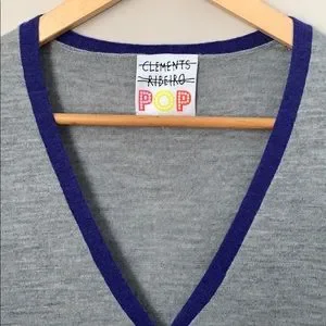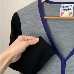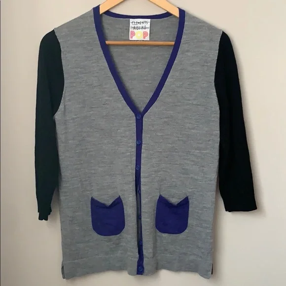 London Designer Clements Ribeiro POP Cardigan. 100% soft Merino Wool. Button front, 3/4 length sleeve. Colour block, black sleeves with blue rubbing. In excellent condition.