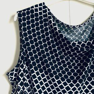 Very good preowned condition, long, asymmetrical, stretchy, flouncy, sleeveless, cascade/cowl neck tank top by Cleo. Features a trippy, scale like pattern that transitions from guitar-pick-shapes to diamonds and 'v's. I must've had my camera on 'vivid cool' because it looks bluer in some of the photos, but it is most definitely black and white.