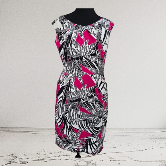 Chic backless dress with bold black and pink pattern. Perfect for making a statement. Length 36" Bust 32" Waist 30"