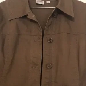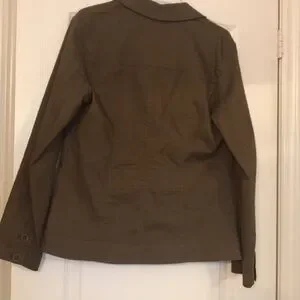 Stylish brown button-up jacket. Perfect for any occasion. 84% cotton, 14% polyester, 2% spandex. Excellent condition.