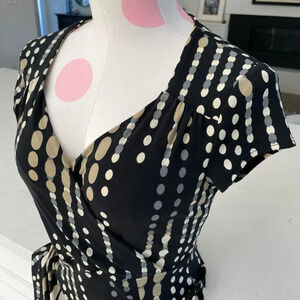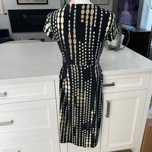 Cleo Cap Slv Faux Wrap Fit & Flare Circle Pattern Dress Blk Cream Gry Tan Sz 2