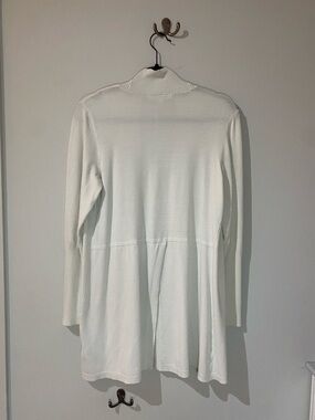 Lightweight open-front cardigan with ribbed shawl collar. Soft knit fabric and long sleeves. Easy neutral color for layering.