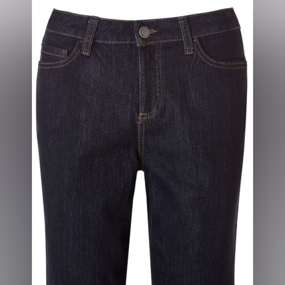 Curvy signature fit denim straight leg slimming jean with front slimming interior panel, zipper closure, five pocket styling, back pocket detailing and rivet details