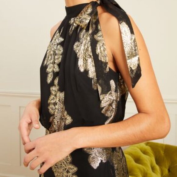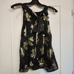 Brand new Cleo halter shirt with gold metallic flowers and bow. Great for New Year's or Christmas Party
