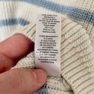 Cleo Half Zip Blue and White Coastal Stripe Knit Sweater Size Large. Acrylic blend, nice and soft and not itchy. Size large petite but fits oversized. Excellent condition.