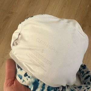 Stylish sports bra by Cleo Harper. Features a blue and white pattern. Comfortable and supportive design.