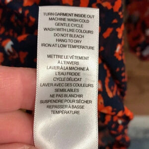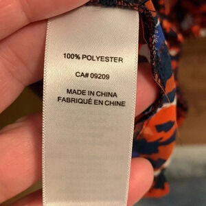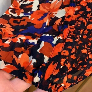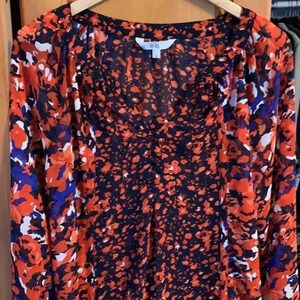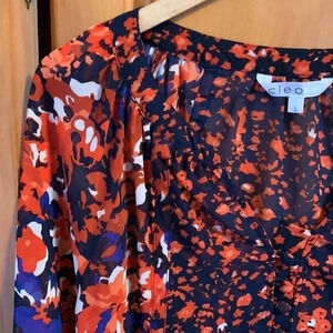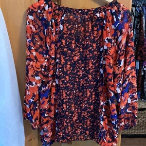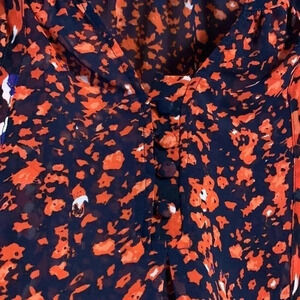 Navy, orange and white floral pattern. 3 buttons on chest at collar. Long sleeves with elastic. Light and semi sheer. Loose elastic at bottom hem. Very pretty. Size Large.