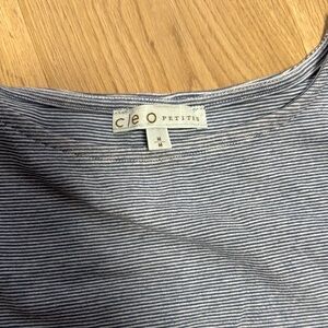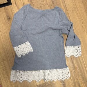 This stylish blouse by Cleo showcases a soft gray fabric enhanced with elegant white lace trim along the hem and sleeves. The 3/4 sleeve design and classic crew neckline add a touch of sophistication, making it a versatile choice for various occasions.