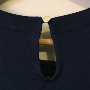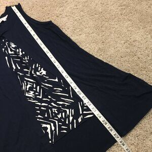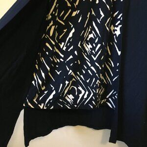 Very good preowned condition, stretchy open cardigan vest and tank top in one by Cleo. This is such an awesome top. The outer layer is a dark, dark, navy blue/almost black with a rounded neck, while the under features an abstract dark navy blue and white pattern semi-cropped tank. Just an amazing piece. I'm unsure what the fabric is but it feels like it could be rayon or viscose as it is soft and natural feeling, but I could be wrong. There is an illusion or window in the front between top and bottom layer and a small keyhole at the back where the closure is. A very nice and unique piece by a Canadian company.