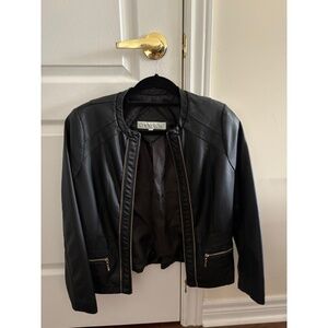 Classic and chic Cleo Petites black faux leather moto jacket. Features zipper front closure, zippered pockets, and seamed paneling for a flattering silhouette. Lightweight with full lining — perfect for layering over dresses, tops, or jeans.