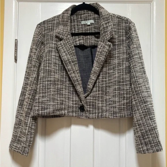Elevate your "work-to-weekend" wardrobe with this chic Cleo Petites cropped blazer. Featuring a beautiful textured knit that mimics a classic tweed, this piece offers a polished, structured look without the weight. The cropped silhouette is the "defining silhouette" of the season, perfectly balancing high-waisted trousers or your favorite pair of denim.