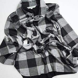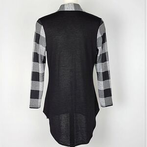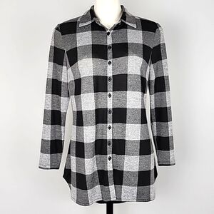 Excellent pre-owned condition, Cleo Petites long button up black white plaid collared shirt, super soft stretch, size medium. super soft stretchy lightweight longer at the back No stains, tears or holes. From a non-smoking home. Please see pics with measurements to ensure proper fit. Please don't hesitate to message me if you have any questions. 🛍 Bundle & Save when you buy more than one item in my closet!