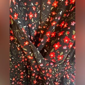 Cleo Petites Women Size XL Floral Midi Dress Black Red White Ruched Waist V Neck