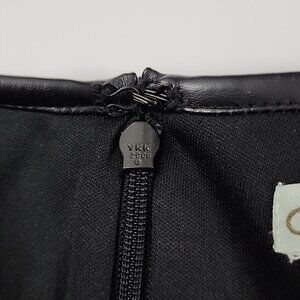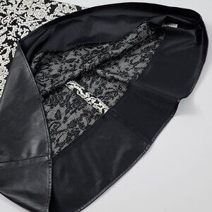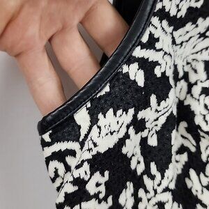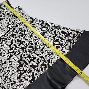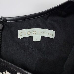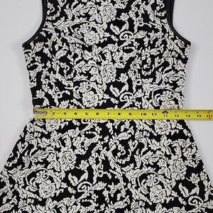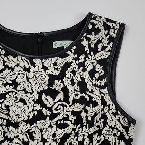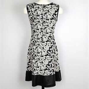 Excellent pre-owned condition, Cleo Petites women's sleeveless fit & flare style midi dress in black with all over white floral pattern in a soft lightweight stretch fabric and faux leather trim and large bottom hem band, size 6.